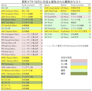 連合軍側の沈没艦船は11隻。沈めたはずの貨物船で名前の載っていないものもありますが、この11隻の中で撃沈ほぼ確実は2-3隻でしょう。リストにある8隻の潜水艦のうち1隻でも本当に沈んでいてくれたらラッキーですが、この8隻の潜水艦のなかで一番の注目はSS Guardfish。トラック島周辺の米軍潜水艦の跳梁が目に余ったので、ASWスキルの訓練に専念していたパイロットをのせた百式重爆にASW任務を始めさせました。潜水艦に250kg爆弾が命中したという報告はこの10月3日のものが初めてで、たとえ沈没していなくても追い返すことができただけでも上出来です。さてあと、このリストの中で両軍を通じて一番の大物であるCVE Long Islandはどうなったんでしょうね。